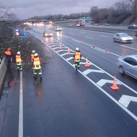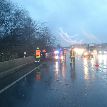 Ein größerer Baum war auf dem Grünstreifen neben der Autobahnauffahrt durch die Sturmeinwirkung umgefallen und ragte mit dem Großteil seiner Krone über die Fahrbahnbegrenzung auf die Beschleunigungsspur. Der Baum wurde mittels Kettensäge soweit zerkleinert, dass eine weitere Gefährdung und Beeinträchtigung des Verkehrs ausgeschlossen werden konnte. Ein zweiter Baum, der ebenfalls umgefallen war und nur noch durch einen instabilen Zaun vor der unmittelbaren Beeinträchtigung des Verkehrs abgehalten wurde, musste ebenfalls soweit zurückgeschnitten werden, dass keine Gefahr mehr für den Kraftfahrzeugverkehr auf der Bundesautobahn bestand.