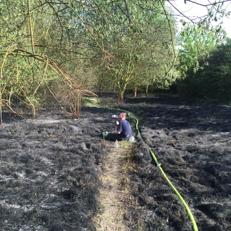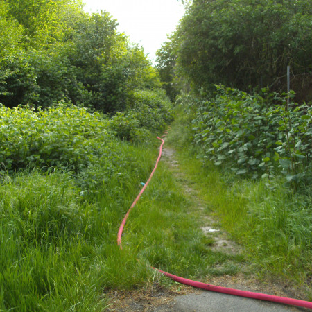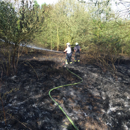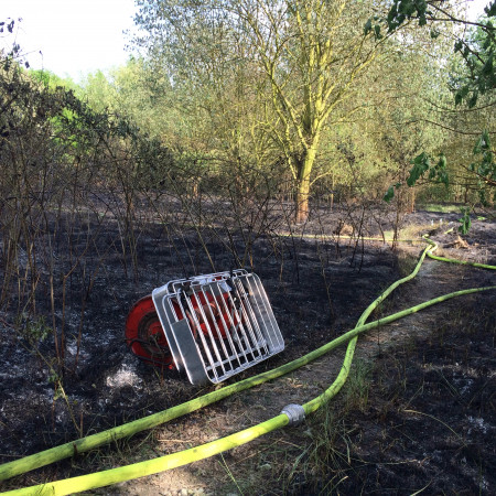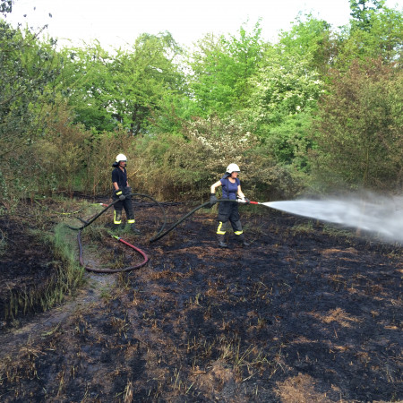 Zur Brandbekämpfung und für die Nachlöscharbeiten wurden daher zwei Einsatzabschnitte – nördlicher und südlicher Abschnitt – gebildet. In jedem Abschnitt wurde, auch aufgrund der eingeschränkten Löschwasserversorgung und der schlechten Zuwegung, ein C-Rohr (Feuerpatschen waren aufgrund der Vegetation leider nicht überall sinnvoll einsetzbar) für die Löschmaßnahmen eingesetzt. Im südlichen Bereich übernahm diese Aufgabe die Besatzung des LF-UB1, im nördlichen die des LF-UB2. Damit der Löschangriff vorgetragen werden konnte, mussten bei warmen 26 Grad Außentemperatur im südlichen Abschnitt ca. 300m C-Schlauch und im nördlichen Abschnitt ca. 260m B- und weitere 240m C-Schlauchleitung jeweils zügig per Hand in teilweise unwegsamen Gelände verlegt werden. Zur Sicherstellung der Löschwasserversorgung im südlichen Einsatzabschnitt wurde das PTLF10 im Pendelverkehr eingesetzt. Insgesamt wurden von den Einsatzkräften ca. 16.000 Liter Wasser für die Löscharbeiten eingesetzt.