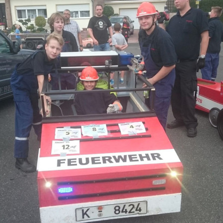 Ab dem Mittag nahm die Jugendfeuerwehr, übrigens zum zweiten Mal in Folge, am Elsdorfer Seifenkistenrennen teil. Wie bereits im letzten Jahr konnte durch Betreuer der Jugendfeuerwehr und Mitgliedern der Löschgruppe eine Seifenkiste rechtzeitig zum Veranstaltungstermin fertiggestellt werden.