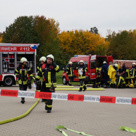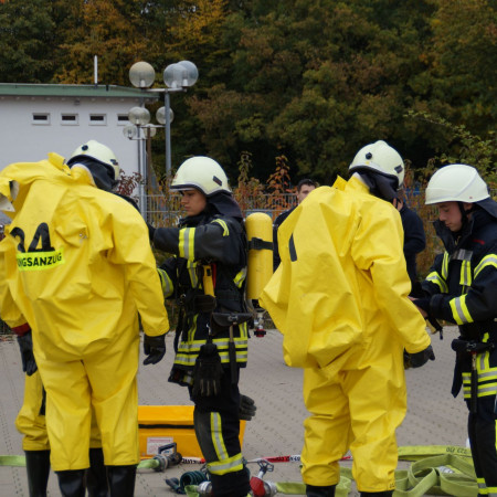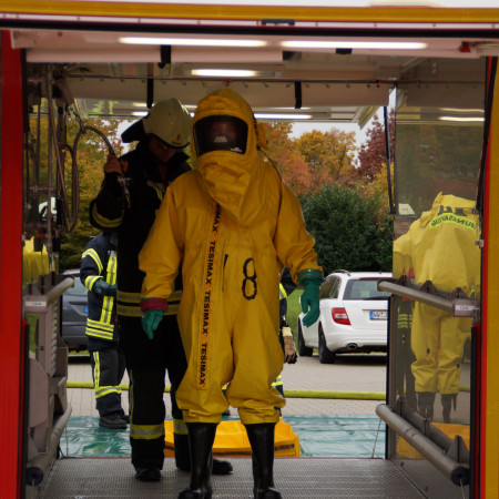 Im Rahmen unseres Übungsdienstes trainierten wir das Abarbeiten einer Gefahrenlage mit einem Chemikalienaustritt. Aufgabe war es, die Gefahrenlage zu beurteilen, unsere Kräfte entsprechend einzusetzen und ein bestehendes Leck zu verschließen, sowie die notwendige Dekontamination vorzubereiten.