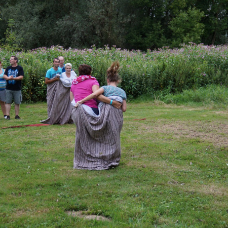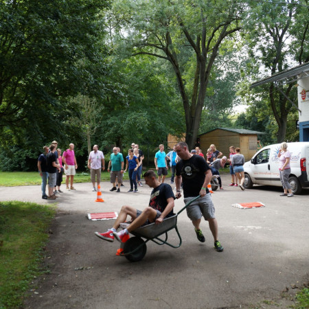 Am Strandbad angekommen, konnte man sich erst mal mit kalten Getränken erfrischen, bevor die Gäste in grüne, gelbe, rote und blaue Teams zusammen gelost. Nun hatte sie immer paarweise bei sportlich-geschickten Disziplinien gegeneinander anzutreten. Dies waren zum Beispiel das Sackhüpfen zu zweit in einem Sack (!) als Staffellauf oder das Durchleiten eines Tischtennisballs durch einen B-Schlauch. Wie oben schon beschrieben, setzte sich das gelbe Team am Ende, nach einem engen Punktestand der ersten drei Teams in der Qualifikation, gegen das Rote Team knapp durch und errang den Sieg. Inzwischen war nach der Siegerehrung das üppige und leckere Buffet zum Grillgut bereit zum Verzehr und die hungrigen Sportler konnten gemütlich und ausgiebig neue Energie zuführen.