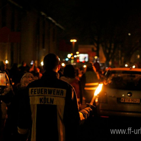 Wie die letzten zwei Jahre zuvor auch, startete der Martinszug an der alten Urbacher Grundschule und zog von der Kupfergasse aus eine große Runde durch das Wohnviertel „Zündorfer Straße, Auf dem Stallberg, Reineckestraße, Stefanstraße, Unter den Erlen, Lichpfad, Elsdorfer Straße, Kaiserstraße“. Nach zirka 45 Minuten war schließlich auch der letzte Teilnehmer am Feuerplatz auf dem „Bungert“ angekommen.